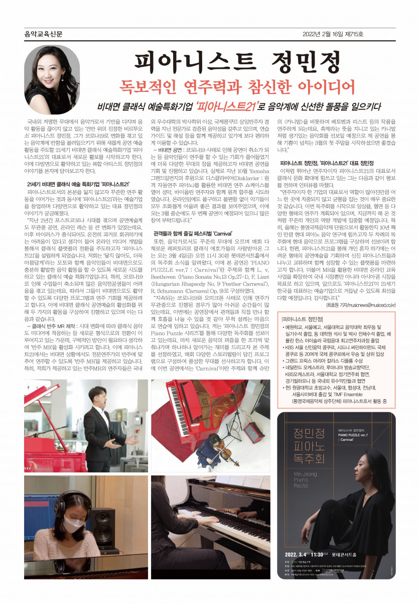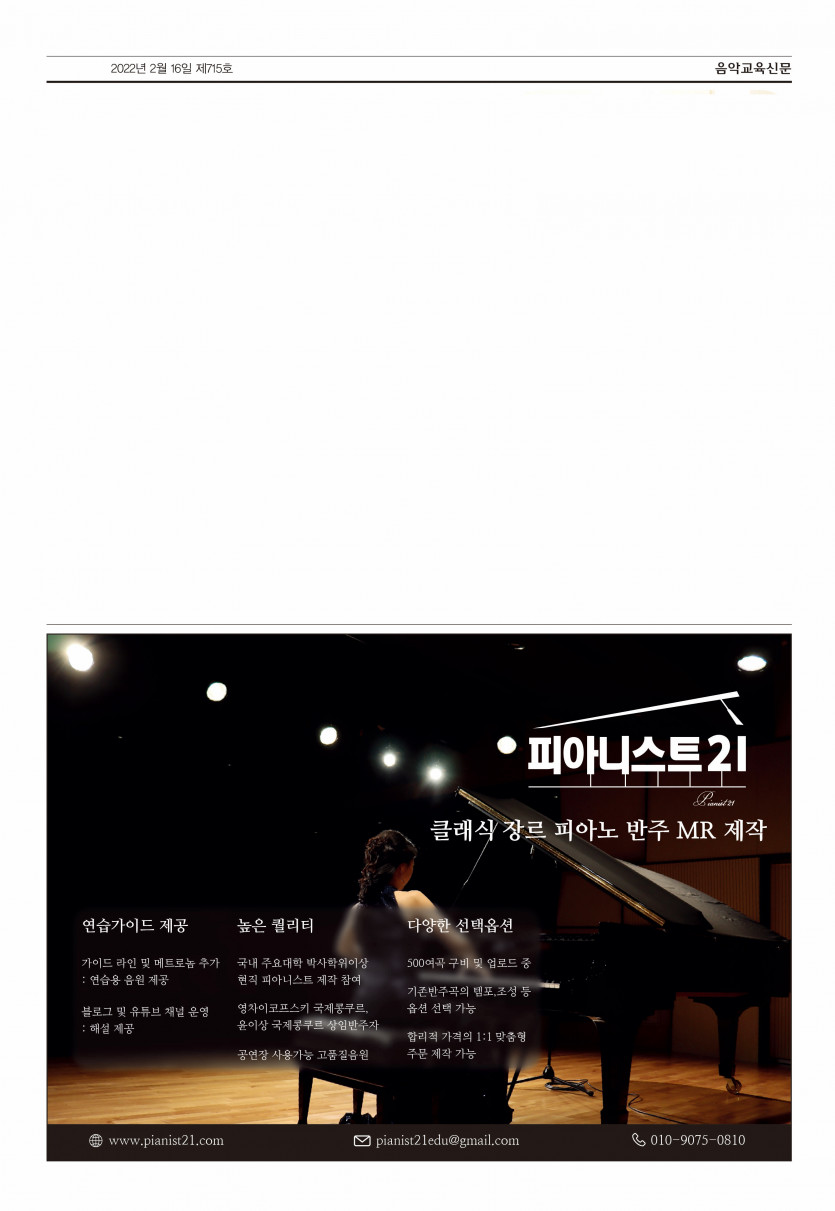 음악교육신문사 기사 페이지 정보 작성자최고관리자 댓글 0건 조회 522회 작성일 22-02-16 10:35 본문 피아니스트21 정민정 대표님께서 인터뷰하신 음악교육신문사 기사가 나왔습니다~ 앞으로도 더욱 많은 관심과 사랑으로 발전하는 피아니스트21 기대해주세요 :) 목록 이전글겨울 콘서트 22.02.22 다음글겨울 콘서트 22.01.24 댓글목록 댓글목록 등록된 댓글이 없습니다.